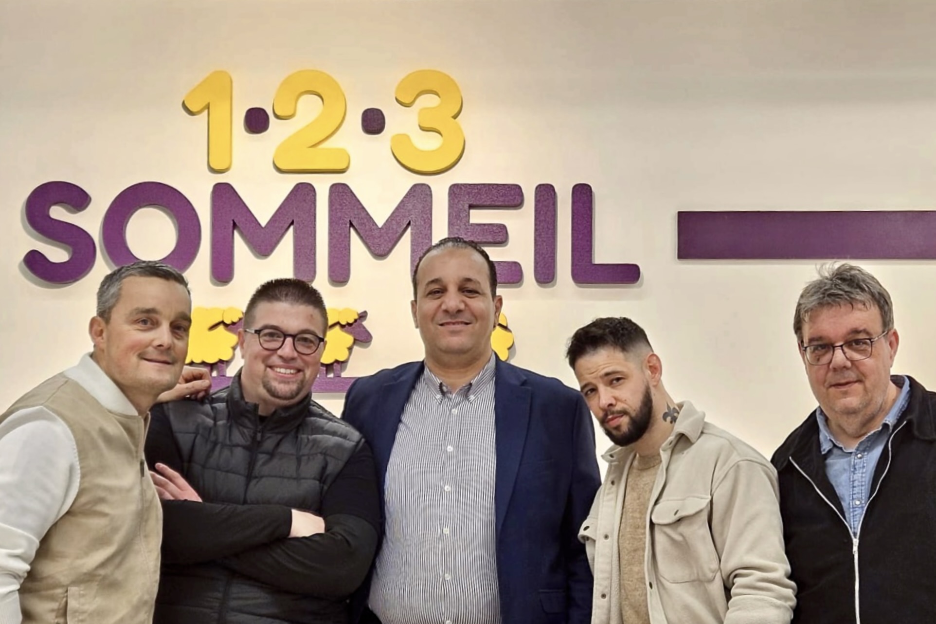 Anis Mzoughi, responsable du magasin de Vélizy (au centre), entouré d’une partie des associés de la marque 1.2.3 Sommeil.