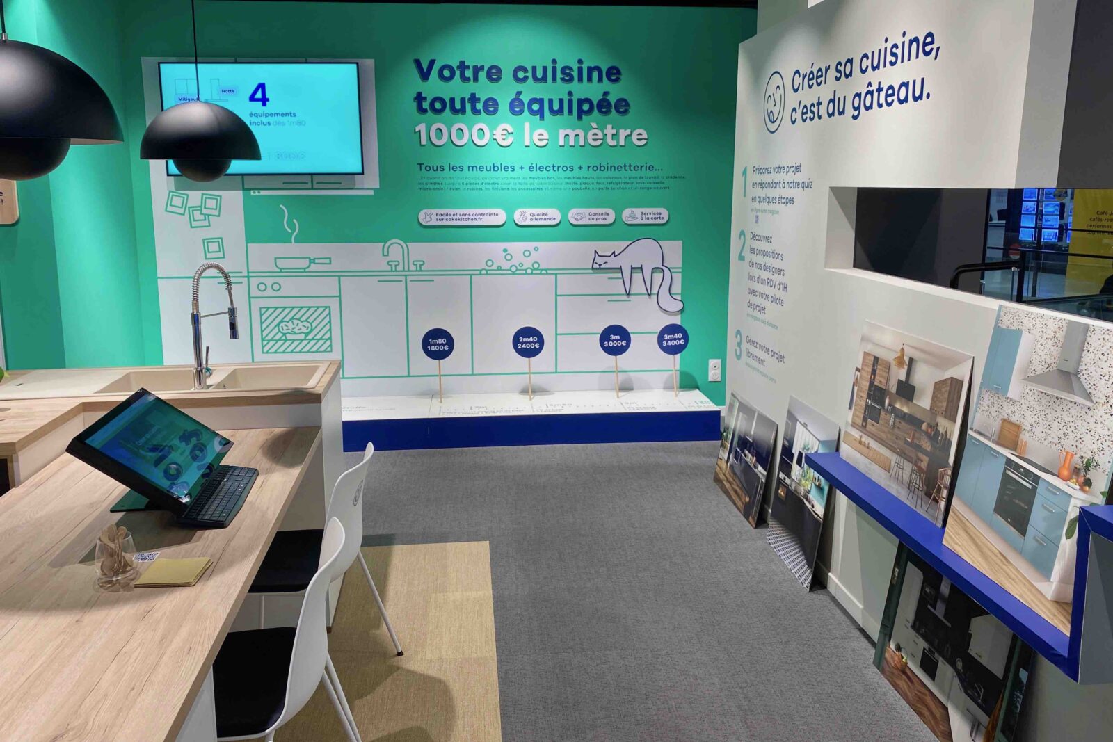 • 2 : Une cuisine centrale présente la cuisine Cake Kitchen à vivre. Elle permet aux clients de se projeter dans leur future cuisine et d’expérimenter l’exhaustivité des meubles disponibles. Cet espace est complété par un mur “catalogue”, qui permet de visualiser, toucher et découvrir, l’ensemble des gammes de produits, des coloris, des accessoires, des finitions…