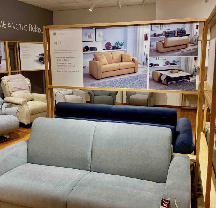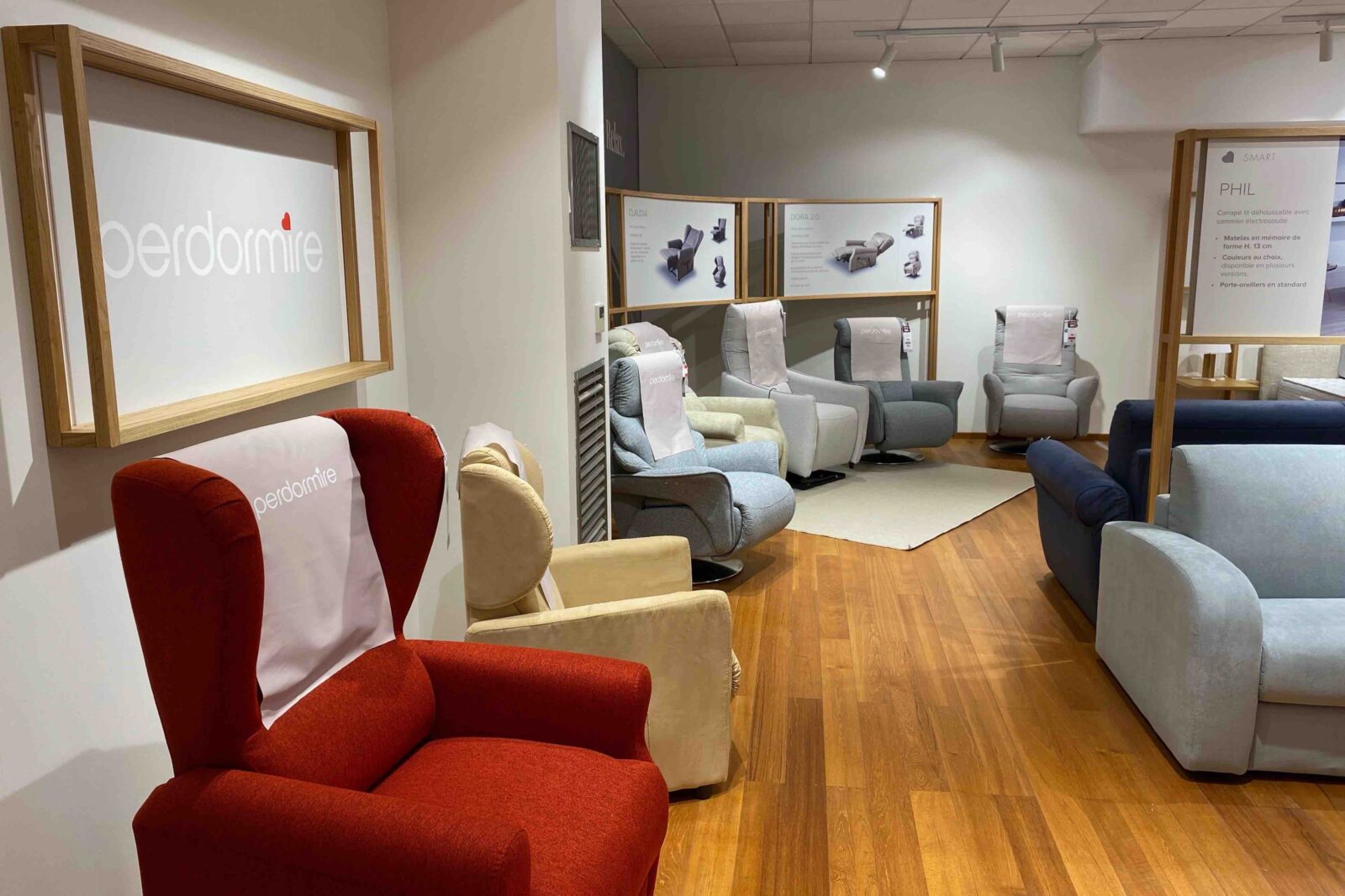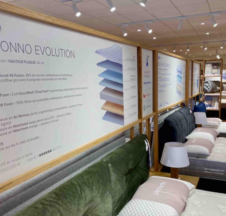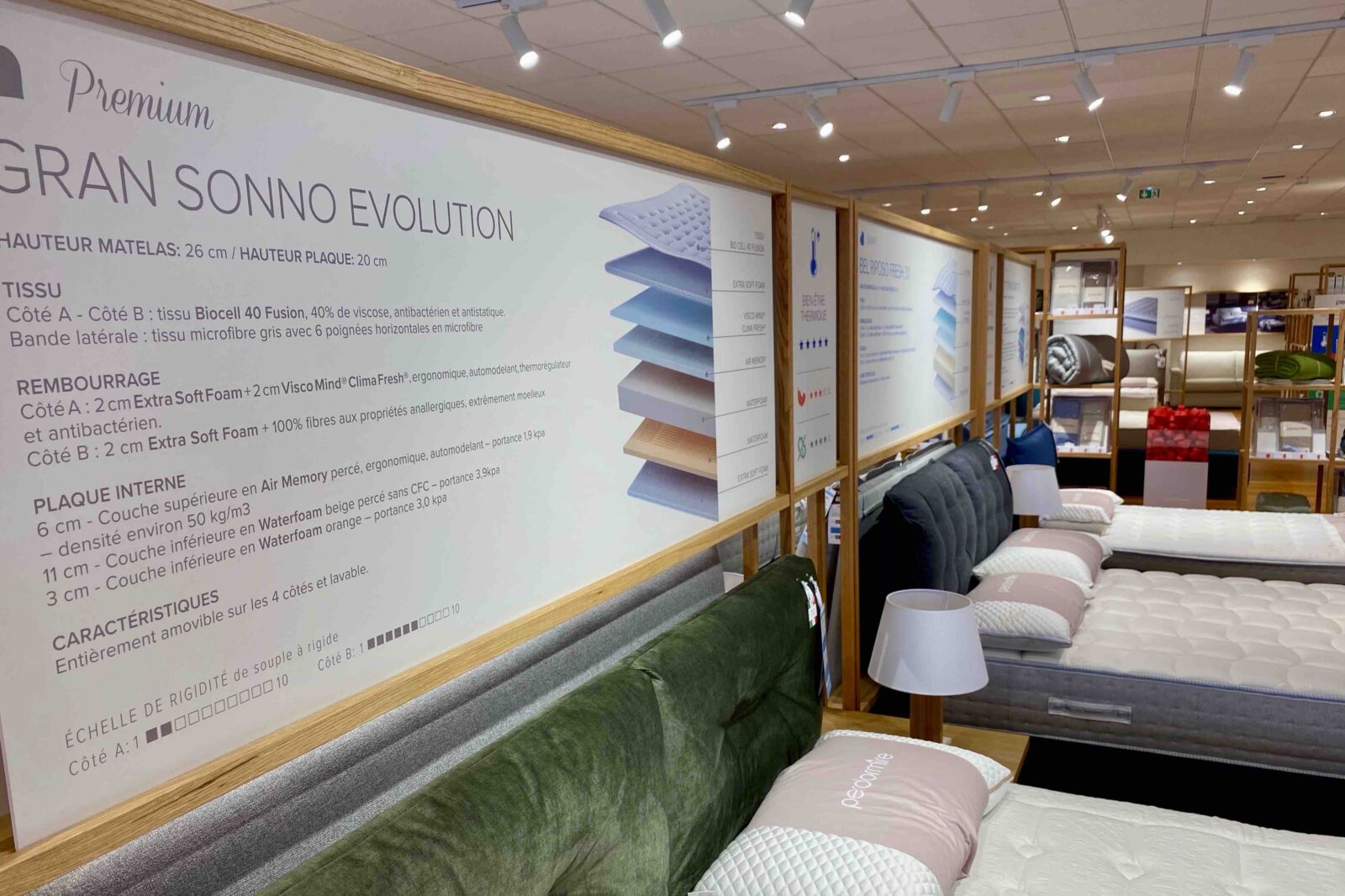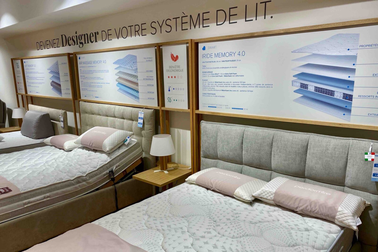 À noter : l’assortiment s’avère 100 % italien (“italianité” oblige !) et, excepté le linge de lit, les protège-matelas, les protections de sommiers, les édredons, les parures de draps et quelques autres accessoires, une très grande partie des produits sort des usines Materassificio Montalese ; y compris – ce n’est pas anodin – les différents oreillers proposés à la vente, ainsi que quelques fauteuils relax et les canapés-lits. Concernant ces derniers produits, signalons ici que l’offre “siège” est disposée au fond du point de vente. Le concept PerDormire n’impose aucun parcours fléché à ses clients. La stratégie de l’Italien consiste à laisser le consommateur découvrir seul l’offre du magasin, au moins dans un premier temps ; avant que le/la vendeur(euse) n’identifie les attentes du chaland et ne l’oriente vers les solutions les mieux adaptées à ses besoins (et à son budget). L’agencement, les cloisons ajourées, les meubles de présentation, les outils d’ILV et de PLV… : tous les éléments du concept, valorisés par un éclairage particulièrement soigné et efficace, incitent à la découverte et au coup de… cœur, symbole/gimmick qui, faut-il le rappeler ?, fait partie intégrante du logo de l’enseigne.