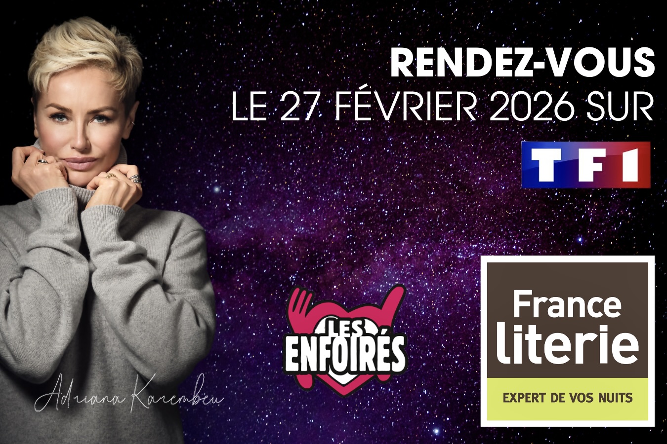 À l’occasion de la diffusion du concert des Enfoirés 2026 sur TF1, le 27 février prochain, France Literie reconduit son partenariat avec ce programme à forte audience afin de soutenir sa stratégie nationale de notoriété. L’enseigne déploie d’ores et déjà un dispositif TV centré sur la diffusion d’un spot avec Adriana Karembeu, dans le cadre des annonces de l’événement solidaire au profit des Restos du Cœur.