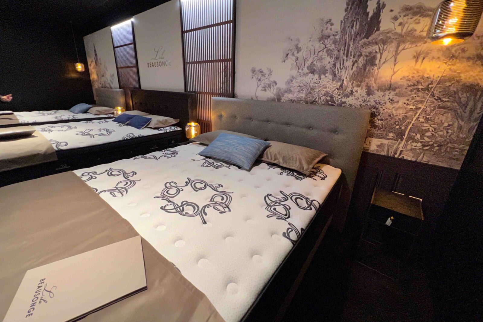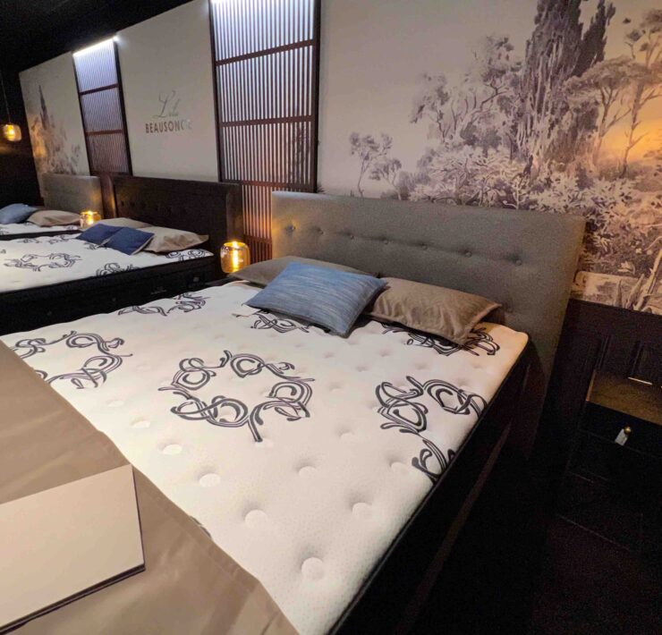 Fruit d’un travail de presque deux ans, les équipes France Literie et leurs prestataires ont conçu cet « écrin », dans lequel les trois collections présentées plus haut vont pouvoir s’exprimer, en essayant de répondre au mieux aux attentes des consommateurs de produits haut de gamme, en tout cas telles qu’elles ont été identifiées dans diverses enquêtes. Résultat : à la fois « confidentiel » et « émotionnel », l’Espace Prestige se présente comme « un espace exclusif, intimiste et déco, dans lequel tout exprime le confort », pour « séduire et rassurer le consommateur, par l’expression de tous nos savoir-faire ». Volontairement en rupture visuelle et physique avec le cœur du magasin, qui, soit dit en passant, ne renonce surtout pas à sa vocation (« rendre accessible au plus grand nombre la literie de qualité », ceci grâce aux “Imbattables”, “Espace Nature”, “Boutique” et autres “Lab’”), l’Espace Prestige marque sa différence par une moquette épaisse de couleur noire, des plafonds noirs eux aussi et un mix d’éclairages (directs, indirects et d’ambiance) finement dosé. À l’intérieur : trois marques « obligatoires » (Haute Couture, Lila Beausonge, Grand Hôtel) et trois “box” (un par marque) adossés aux murs de l’espace. Au centre (quand la surface le permet et en cohérence avec l’offre) : des marques “Prestige” dites « complémentaires » (telles André Renault, Treca, Simmons Beautyrest…).
