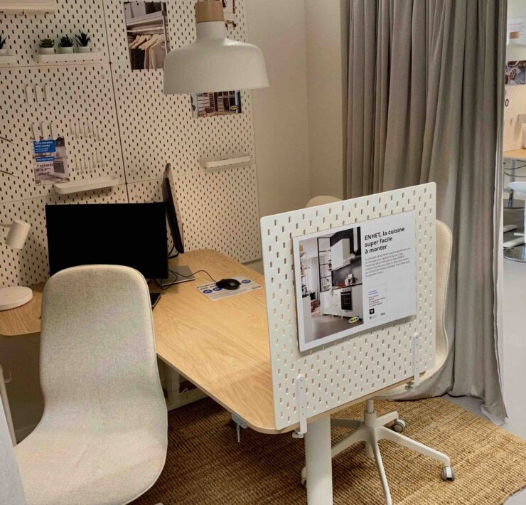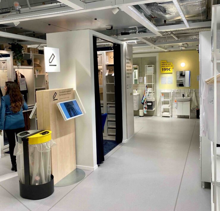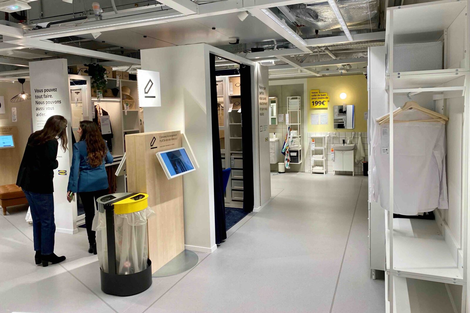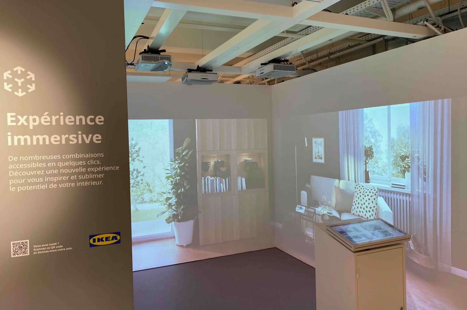 Et en matière d’inspiration, le “clou du spectacle” de ce nouvel “Atelier”, c’est bien sûr “l’Expérience immersive” évoquée plus haut. Grâce à une technologie simple de réalité virtuelle, développée avec la start-up française Ugla (les solutions à partir de lunettes et autres casques n’ont pas été retenues, à la fois pour des questions d’hygiène – le Covid est passé par là – et d’accès simplifié pour tous, notamment les familles), les clients, “immergés” dans un espace de quelque 9 m2, peuvent interagir via une tablette avec 80 ambiances projetées sur trois murs. Ils peuvent aussi afficher les informations des produits de leur choix (prix, matières, QR codes renvoyant – dès leur scan via le smartphone – aux fiches des références correspondantes sur le site marchand “Ikea.fr”), puis les ajouter à leur panier grâce à leur smartphone et l’application Ikea. Objectif de l’enseigne : « Améliorer l’expérience client en effaçant progressivement les frontières entre points de contact physiques et digitaux. »