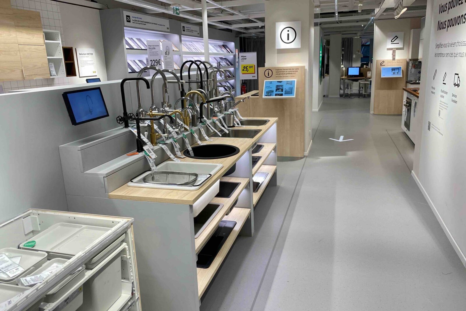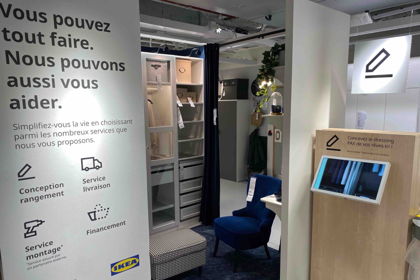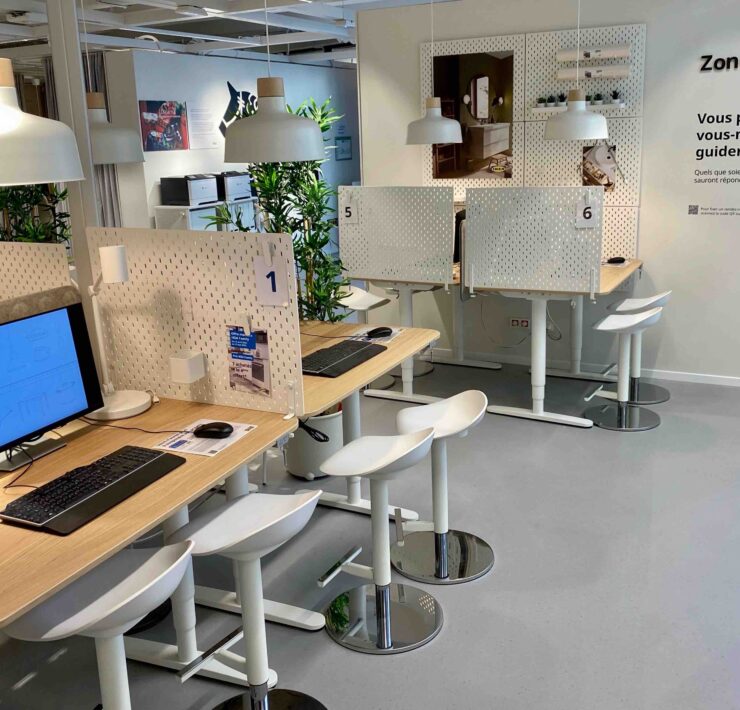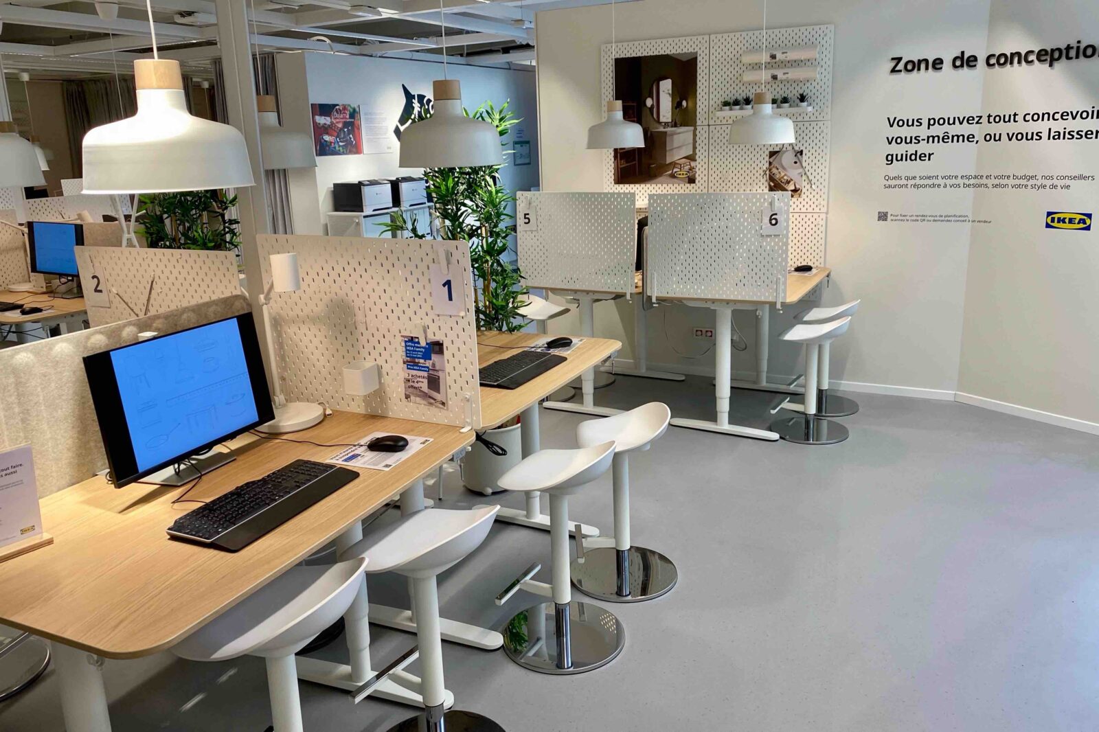 En d’autres termes, cet “Atelier” (ouvert de 10h à 20h, du lundi au samedi et de 11h à 20h, le dimanche) apparaît effectivement comme un espace d’élaboration de projets d’ameublement, accessible en accès libre et/ou sur rendez-vous (réservation en ligne et/ou en magasin). À la barre : une équipe de 22 « collaborateurs experts », qui conseilleront les clients qui le souhaitent dans la planification de leurs projets d’aménagement de cuisines (largement mises en avant), mais aussi de rangements, de dressings, de salons/salles à manger, de bureaux, de salles de bains ou encore de chambres (31 ambiances mettant en scène l’assortiment Ikea sont proposées, pour que les clients « puissent s’inspirer et tester les solutions d’aménagement »). L’aide à la conception sera proposée à 29 € (pour une aide à la conception d’une cuisine) et à 9 € (pour un rangement ou un dressing), remboursés sous forme de bons d’achat pour les membres du programme de fidélité “Ikea Family”. Pas moins de 45 créneaux de rendez-vous seront proposés par jour (contre une vingtaine aujourd’hui au magasin “Ikea City Paris La Madeleine”). Par ailleurs, des postes de planification et des bornes de commandes en accès libre, permettront également aux clients d’effectuer leurs achats, en autonomie ou avec l’accompagnement des collaborateurs de “l’Atelier”.