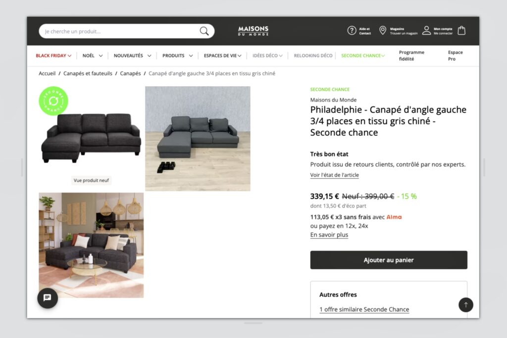 Pour Maisons du Monde, son offre de produits d’occasion (“Seconde Chance”), est une opportunité de permettre à ses clients de se faire plaisir, en faisant l’acquisition de produits de qualité, parfaitement aptes à être utilisés, tout en bénéficiant de remises allant jusqu’à -50 % en magasin et, désormais, de -15 % à -30 % sur le web (selon les types de défauts).