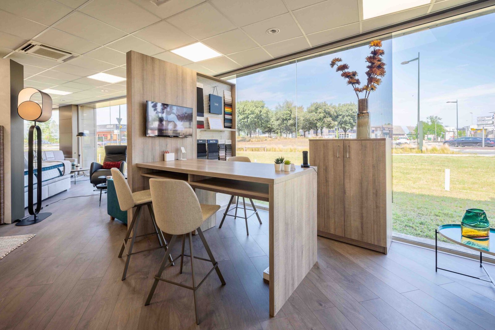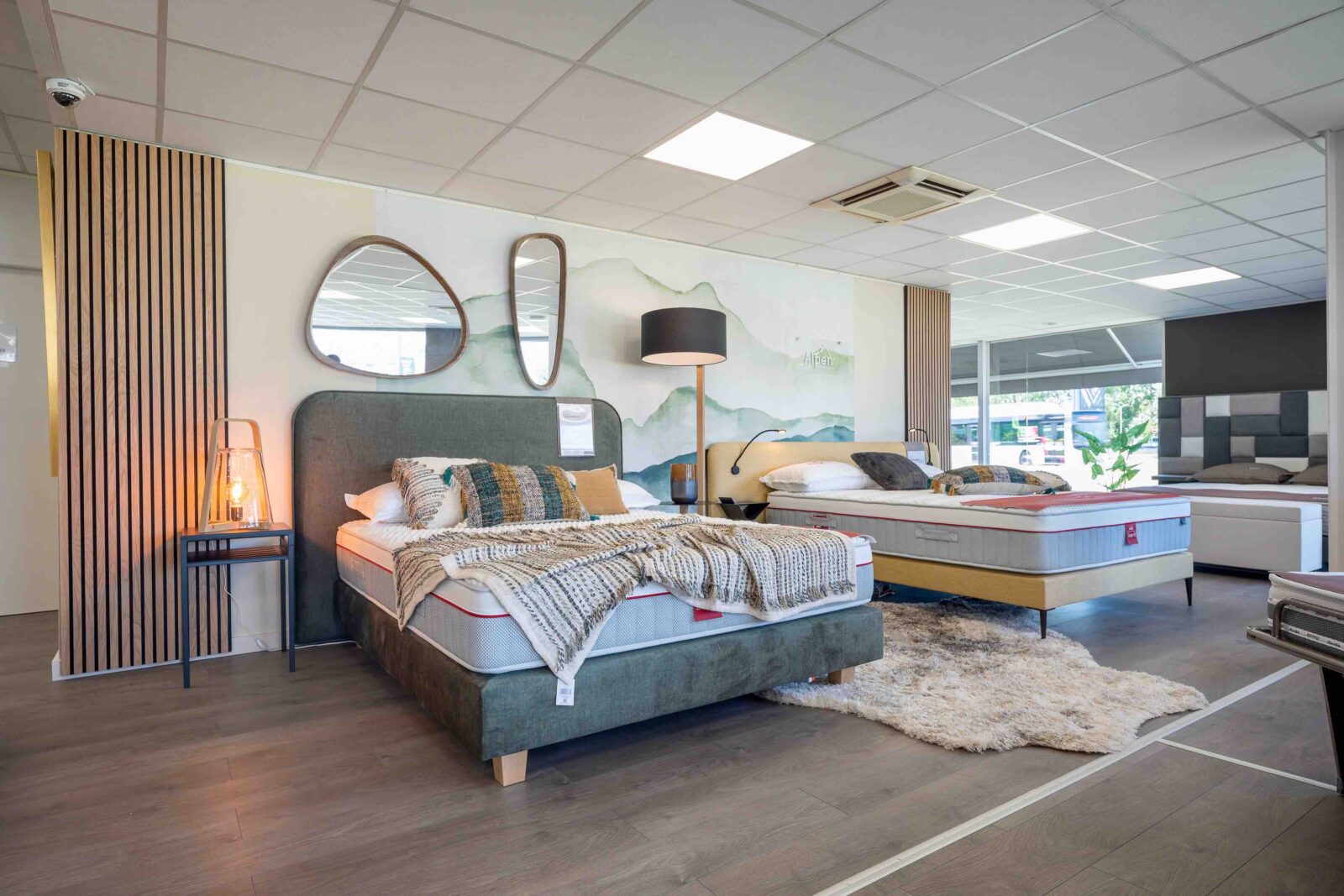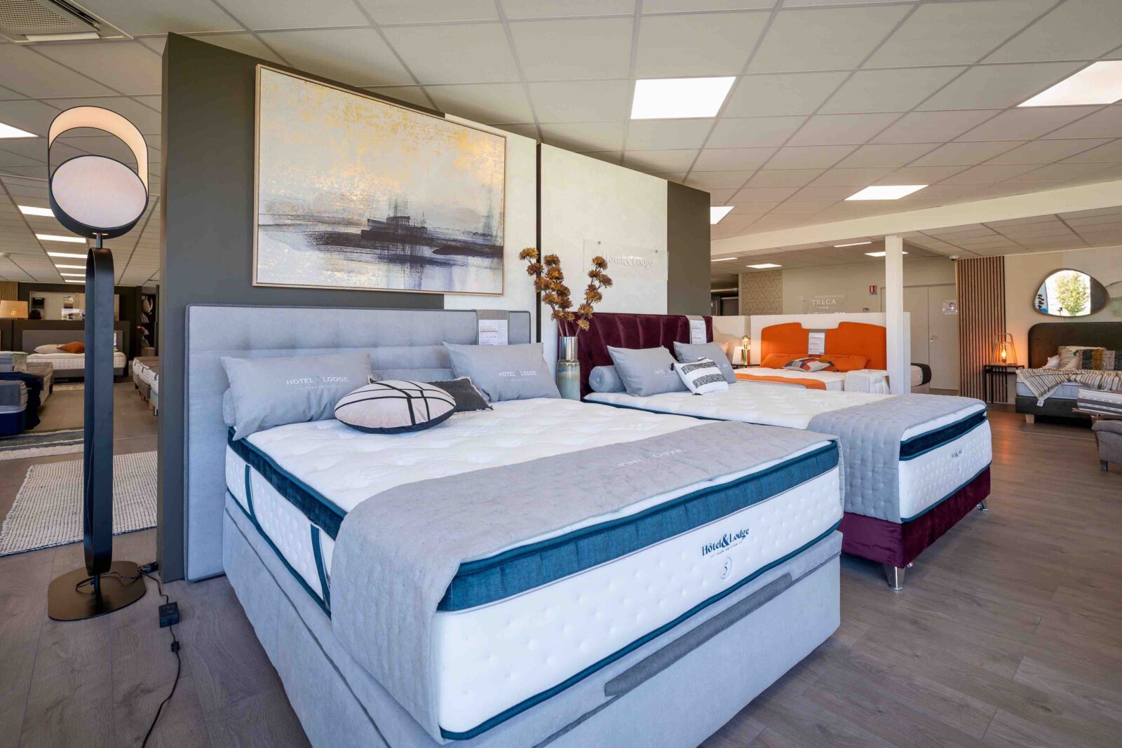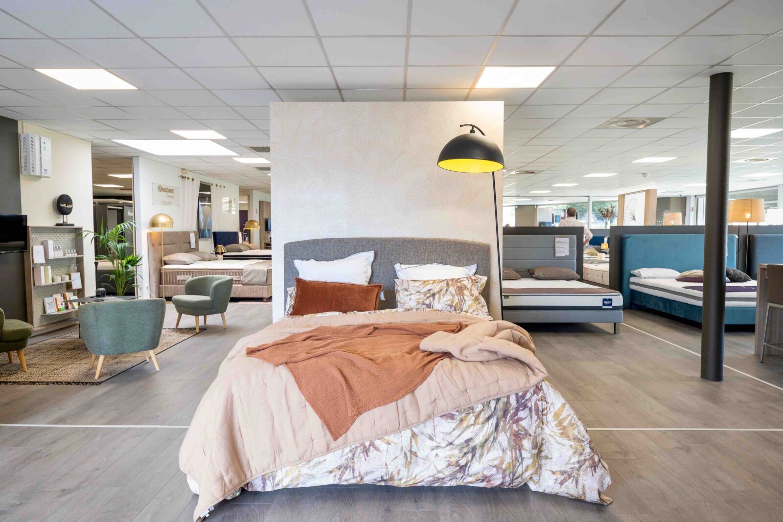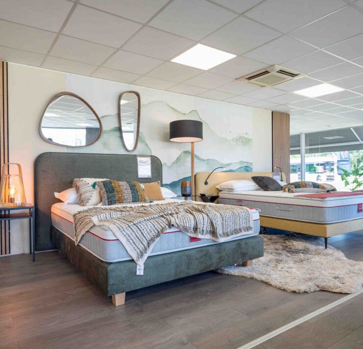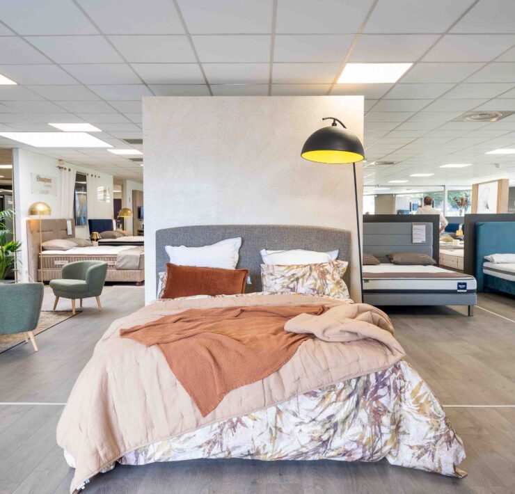 Imaginé par une styliste autour des notions (chères à l’enseigne depuis de nombreuses années) de bien-être, de confort et de sérénité, afin d’offrir au consommateur une expérience inédite et mémorable, ce nouveau concept, dont la “mise en bouche” commencera par un ensemble “expo-déco” placé dès l’entrée du magasin (effet “waouh” garanti !), comportera (en résumant à l’extrême) les éléments essentiels que sont “L’Espace Bien-Être” (brumes d’oreiller, parfums d’ambiance…) et “L’Atelier” (conseils d’experts, personnalisation…), mais va surtout véritablement faire franchir un cap important à l’ensemble des magasins du réseau en matière de mise en scène, de valorisation des marques et de décoration. Objectif, dixit Virginie Mathe, responsable marketing et communication de l’enseigne depuis mai 2022 : « Offrir à nos consommateurs un havre de tranquillité et de confort, qui facilite la montée en gamme. » Dans ce cadre notamment, les marques et leurs produits bénéficieront de cloisons basses surmontées de plexiglas transparents sur lesquels seront gravés uniformément leurs logos. But avoué de cette nouvelle façon de “merchandiser” : valoriser les marques dans leurs univers respectifs, mais ceci au sein d’un ensemble cohérent, ambiancé “Grand Litier”. Différents espaces seront par ailleurs matérialisés par des cloisons plus hautes, de trois couleurs différentes, ainsi que par des menuiseries décoratives assorties, encadrant des vitrages imprimés de motifs décoratifs du plus bel effet. Enfin, outre les traditionnels linges de lit, accessoires et produits de para-literie, habilement disposés autour des matelas, sommiers, chevets et autres têtes de lits : une multitude d’éléments décoratifs ! Au menu : rideaux, tapis, images encadrées, luminaires, bougies, vases, plantes, miroirs…