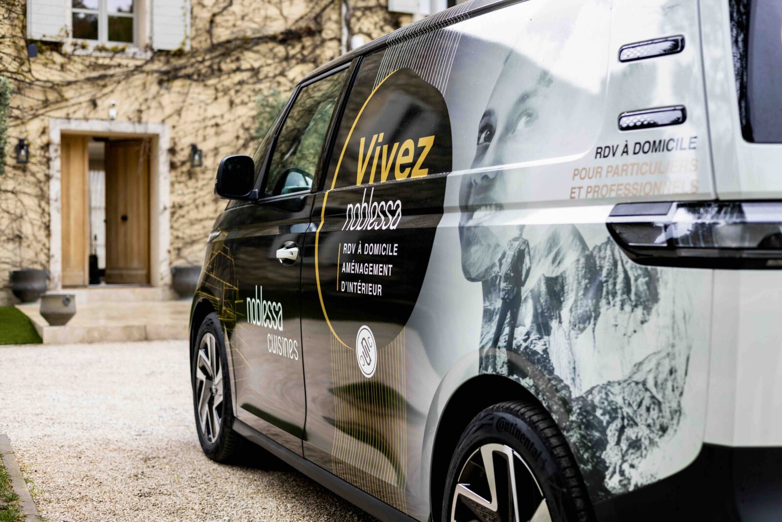 Ainsi, pour les clients qui le souhaitent, c’est à bord d’un “ID. Buzz”, le célèbre combi Volkswagen, remasterisé et électrique, que le concepteur va se déplacer (voir aussi notre galerie d’images ci-dessus). Grâce à ce véhicule, floqué aux couleurs de noblessa bien sûr, mais surtout équipé et aménagé d’échantillons, l’expert noblessa va pouvoir présenter produits, matériaux, solutions d’aménagement, directement chez le client et apporter à celui-ci, de façon “délocalisée” par rapport au point de vente en quelque sorte, l’ensemble des conseils et études de projets susceptibles d’emporter son adhésion.