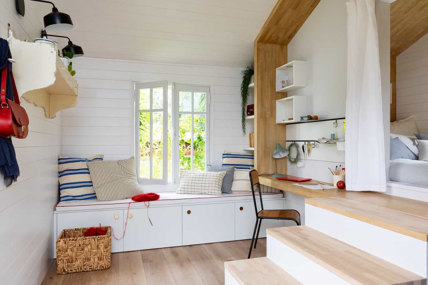 Au menu de ces trois espaces habilement imbriqués les uns dans les autres : une entrée et vaste bibliothèque sur mesure ; un rangement positionné en hauteur, accessible par une échelle, dans un esprit très “Brooklyn industriel” ; une petite pièce dressing fonctionnelle ; un buffet de campagne vitré ; un petit point d’eau avec coiffeuse, plan de toilette sur mesure, vasque à poser et mitigeur ; un espace bureau ; un escalier qui fait office de rangement “double face” (côté bureau, les niches accueillent livres et classeurs, côté entrée, elles permettent d’entreposer les chaussures) ; et un espace détente, doté d’un lit à même le sol, de quelques niches de rangement et d’un vidéo-projecteur intégré en tête de lit. Un concentré des savoir-faire du fabricant-distributeur haut-savoyard en matière d’aménagement intérieur, de sur mesure et de personnalisation, dans toutes les pièces de la maison !