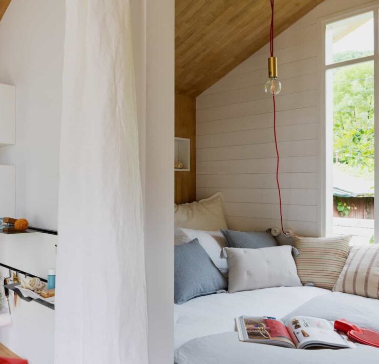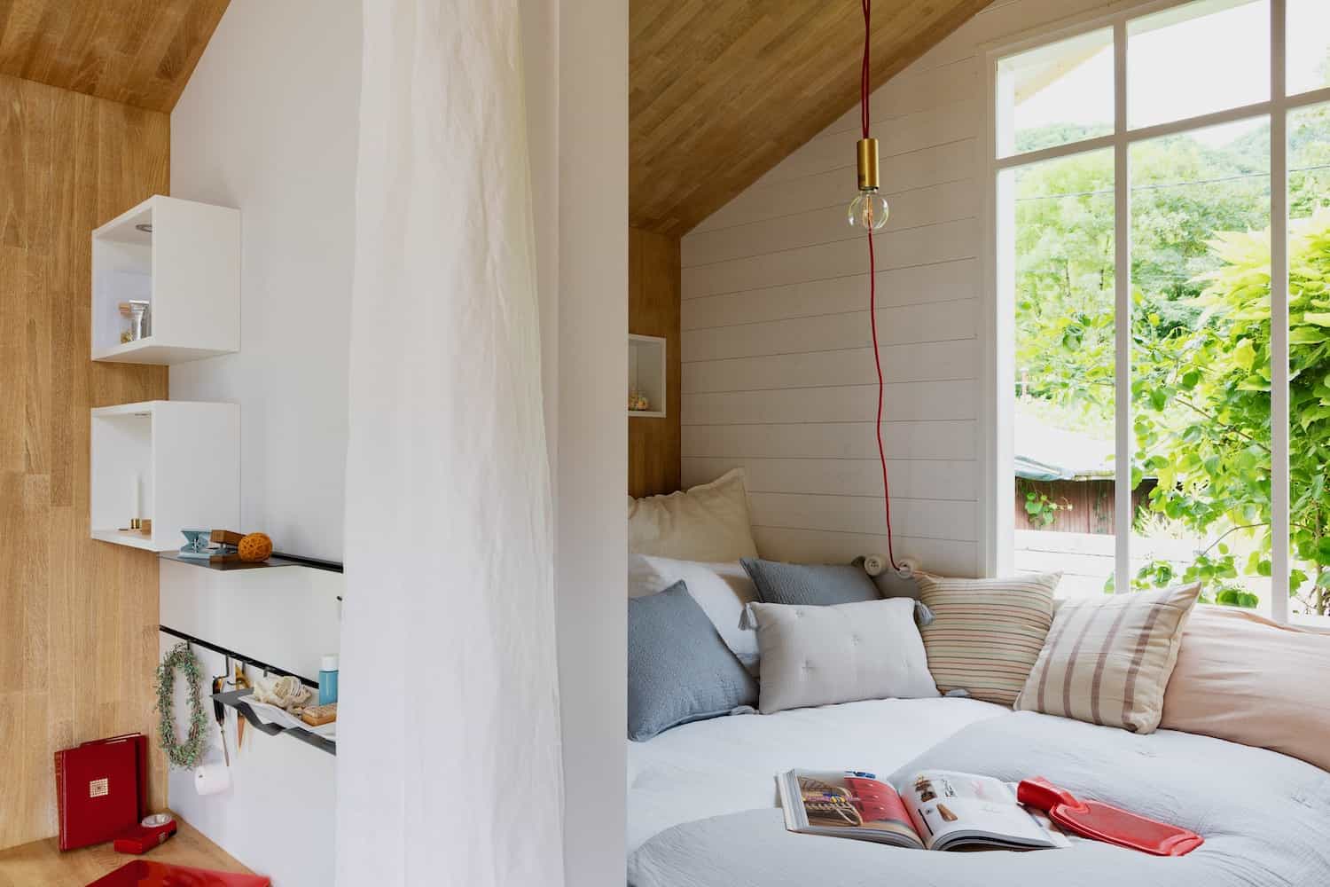 Tout est parti d’un rêve, celui de concrétiser un lieu clos, dédié à l’évasion, au recueillement sur soi et à l’ouverture à la nature ; d’y faire parler les matières aussi, les rangements, les recoins… Le nom de cette “pièce concept” inédite : la “cabane”, tout simplement.