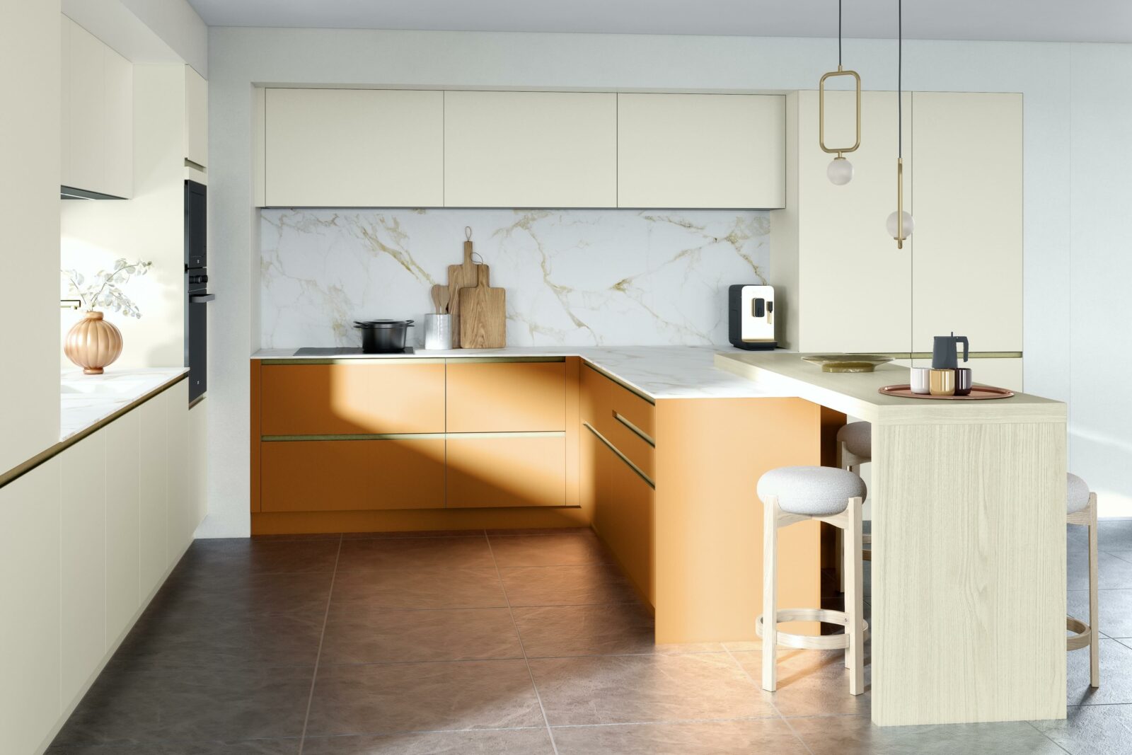 Photo d’ouverture : la cuisine Jungle et sa palette de couleurs, à la fois douce et chaleureuse ; ici : association des teintes Ivoire mat et Fauve mat.